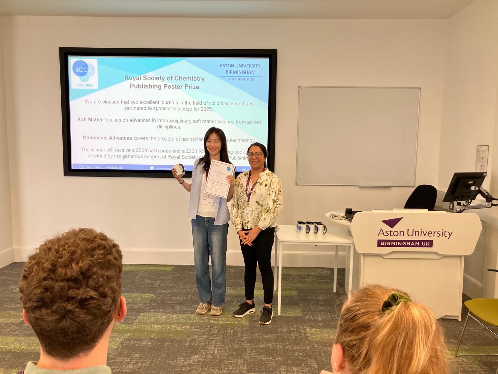 Dr Brianna Knowles was the Australasian Colloid and Interface Society/UK Joint Colloids Group (RSC/SCI) bursary recipient and presented her work on Using Functionalised Silica Nanoparticle Colloids to prepare Antifouling Surface Coatings. David Brossault was the winner of our poster prize sponsored by Soft Matter and RSC books. Runner up prizes went to Ataulla Shegiwal and Tom Wilks.